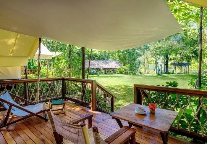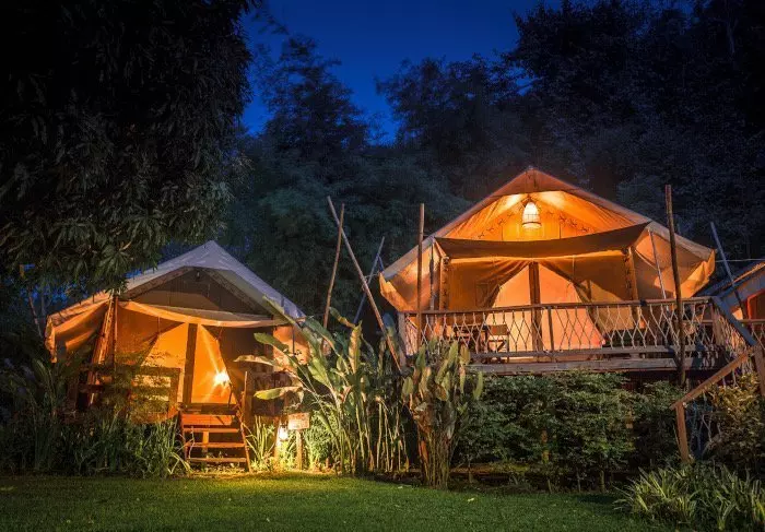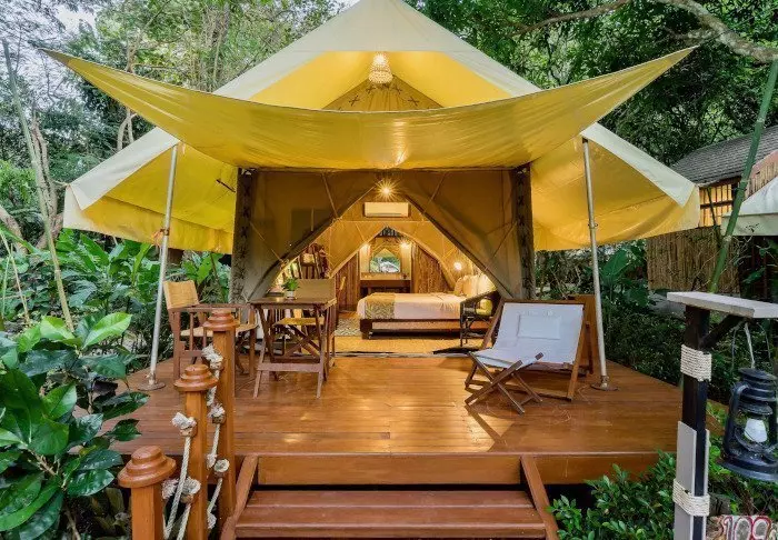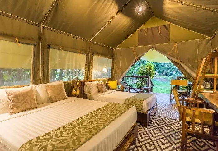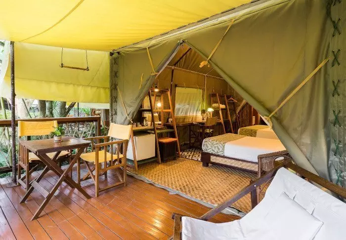 Leiri koostuu 38 luksusteltasta, jotka ovat kooltaan 26 tai 32 m². Teltat on pystytetty korokkeille, joten ne ovat noin puolen metrin korkeudella maanpinnasta. Kaikissa teltoissa on oikeat sängyt, oma kylpyhuone, lämmin vesi, hiustenkuivaaja ja kylpytuotteita sekä oma terassi, missä on mukava istuskella ja nauttia hiljaisuudesta ja vehreistä luontomaisemista. Kaikissa teltoissa on WiFi, ilmastointi, kampauspöytä/kirjoituspöytä, ilmainen pullovesi, jääkaappi ja vedenkeitin teen tai kahvin valmistukseen. Leirissä on hiljaisuus kello 22 jälkeen, jolloin kovaäänisen musiikin sijasta keskitytään viidakon äänten kuuntelemiseen.