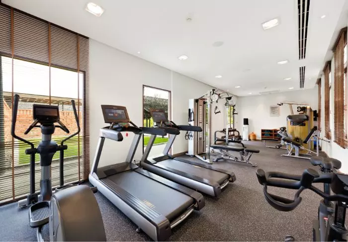 Hotellin kuntokeskuksessa voit treenata sekä vapailla painoilla että erilaisilla kuntosalilaitteilla.