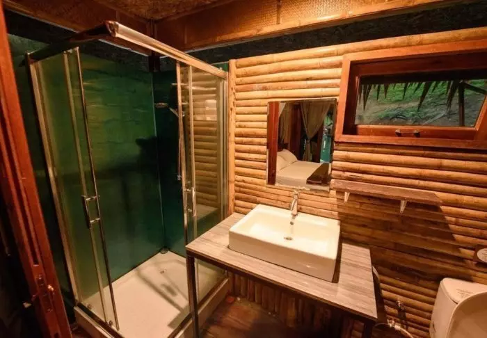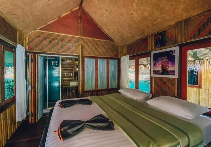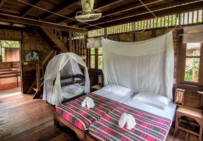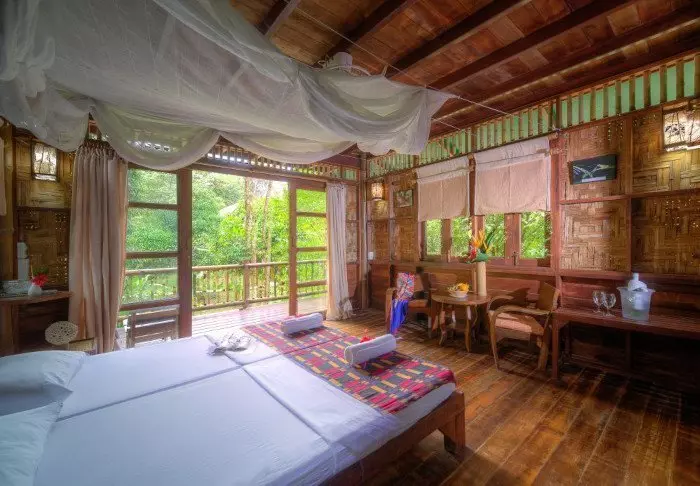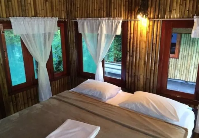 Kaksiosaiseen flotelliin kuuluu yhteensä 100 bambumökkiä. Huoneet ovat sisustukseltaan yksinkertaisia: niissä on mukavat sängyt, hyttysverkot, käsituuletin, taskulamppu, kampauspöytä ja pullovesi sekä pelastusliivit. Huoneissa ei ole sähköä eikä siksi myöskään minibaaria tai WiFiä. Omalla verannalla voit ottaa rennosti riippumatossa ja nauttia maisemista hiljaa virtaavalle joelle, jonka rannoilla kasvaa jättiläiskokoisia bambuja ja villejä orkideoita. Voit myös lähteä uimaan suoraan verannalta tai kokeilla kanoottimelontaa. Kaikissa huoneissa on oma kylpyhuone, WC, kylpytuotteita ja suihku, josta tulee vain kylmää vettä.