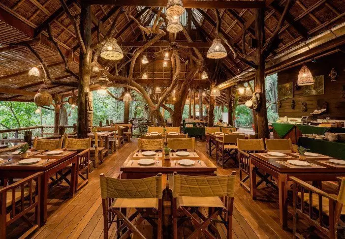 Myös leirin ravintola on rakennettu korokkeelle, josta avautuu hieno näköala ympäröivään maisemaan. Ravintola on avoinna aamiaisesta illallisaikaan ja tarjoaa kattavan listan maukkaita ruokia. Lisäksi puutarhassa grillataan joka ilta. Baarissa on tarjolla laaja valikoima juomia, viinejä ja oluita.