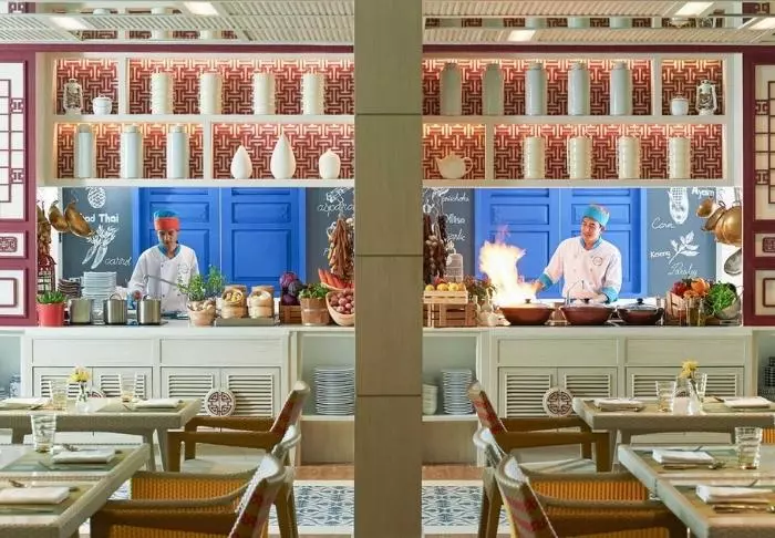 Aloita päiväsi herkullisella amerikkalaistyylisellä buffetaamiaisella The Kitchen -ravintolassa ja käy syömässä Sassi’s Beach Clubissa, jossa voit nauttia thaimaalaisia ja kansainvälisiä ruokia merinäköalalla. The Mellow Bean tarjoilee panini-voileipiä, kahvia ja herkullisia leivonnaisia. Jos kaipaat viilennystä kuuman päivän jälkeen, voit nauttia eksoottisen cocktailin swim-up-baarissa auringon laskiessa horisonttiin.