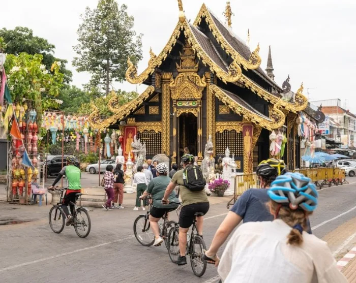 Ensin sinut viedään autolla yhteistyökumppanimme toimistolle, jossa saat pyörän ja kypärän. Lyhyen opastuksen jälkeen on aika lähteä polkemaan ja nauttimaan kaupungin nähtävyyksistä. Reitti on helppo ja tasainen, joten useimmat jaksavat pyöräillä koko matkan. Pyöräilet Chiang Main kapeita ja hiljaisia katuja pitkin viehättävälle Wat Inthakhin Sadue Mueang -temppelille, joka tunnetaan 700-vuotiaasta valkoisesta Buddha-patsaastaan. Pyöräretki jatkuu kolmen kuninkaan monumentin ohi Tha Phae -portille, jonka kautta myyjät aikoinaan toivat tavaroita kaupunkiin. Täällä opas kertoo sinulle Chiang Main historiasta tärkeänä kauppakaupunkina. Matka jatkuu lähellä sijaitsevalle Somphet-torille, missä on aikaa kierrellä ja nauttia paikallisesta tunnelmasta. Saat myös mahdollisuuden maistaa värikkäitä hedelmiä ja makeisia. Seuraavaksi on vuorossa vierailu Wat Chiang Manissa, joka on Chiang Main vanhin temppeli. Täällä säilytetään 1 800 vuotta vanhaa kristallibuddhaa ja 2 500 vuotta vanhaa marmoribuddhaa. Lopuksi käydään vielä katsomassa kaupungin kuuluisinta monumenttia, legendaarista Wat Chedi Luangia. Se oli aikoinaan Smaragdibuddhan koti, mutta nykyään patsas pitää majaansa Wat Phra Kaew -temppelissä Bangkokissa.