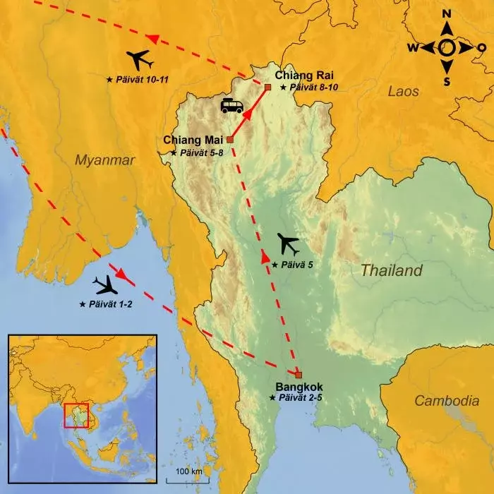 Vietettyäsi pari jännittävää päivää Bangkokissa lennät pohjoiseen viehättävään Chiang Maihin, jossa voit kierrellä värikkäillä markkinoilla, tutustua ikivanhoihin temppeleihin ja nauttia rauhallisemmasta tunnelmasta. Chiang Maissa sinua odottaa hauska pyöräretki, jonka aikana tutustut vanhankaupungin historiallisiin nähtävyyksiin.