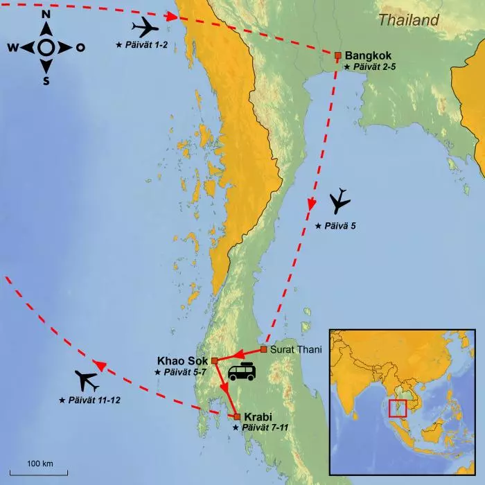Sinut noudetaan hotellilta ja kuljetetaan lentokentälle, josta lennät etelään Surat Thaniin – lentomatka kestää 1 tunti 15 minuuttia. Laskeuduttuasi haet matkatavarasi ja tapaat kuljettajasi, joka odottaa sinua TourCompass-kyltin kanssa saapuvien aulassa. Kuljettaja vie sinut Khao Sokin kansallispuistoon, jossa sinua odottaa todellinen viidakkoseikkailu.
