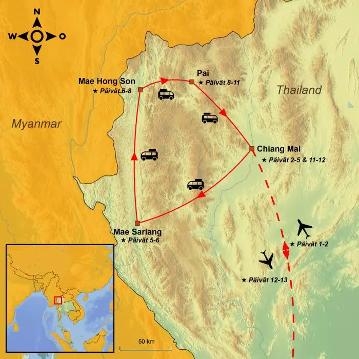 Seikkailu alkaa Chiang Maista, viehättävästä kaupungista, joka on täynnä kulttuuria ja historiaa ja sijaitsee kauniilla paikalla majesteettisten vuorten ympäröimässä laaksossa. Täältä voit lähteä kuuluisalle Mae Hong Son -reitille – yli 600 km:n reitille, joka mutkittelee 1 864 serpentiinimutkan kautta kiehtovissa maisemissa.
