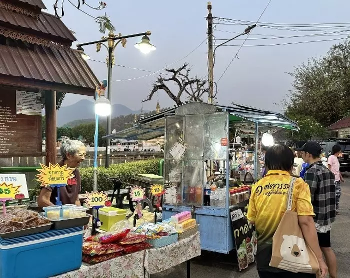 Kävelukatu muuttuu joka ilta vilkkaaksi yötoriksi, jossa voit tutustua kaikkiin ruokakojuihin ja nauttia paikallisen keittiön antimista. Illan ateria nautitaan viltillä matalassa pöydässä paikallisten tapaan. Täällä voit myös ihailla Wat Chong Kham -temppeliä, joka heijastuu samannimiseen järveen sen takana.