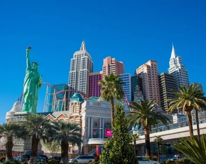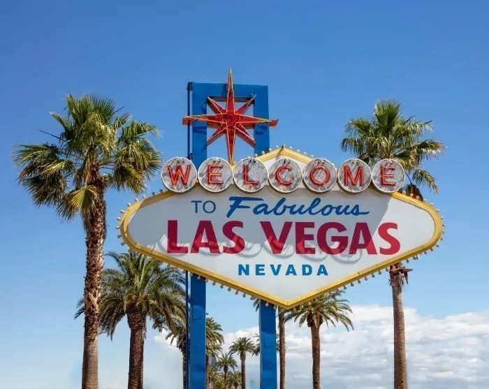 Voit myös ajaa suoraa reittiä “Sin Cityyn”. On melkoinen kontrasti viettää monta päivää henkeäsalpaavissa luontomaisemissa ja sitten yhtäkkiä nähdä horisontissa valtavia, tornimaisia rakennuksia. 6,8 kilometriä pitkää Las Vegas Boulevardia eli The Stripiä reunustavat lukemattomat teemahotellit, ja jos saavut kaupunkiin illalla, voit nähdä hotellien valojen kajastavan horisontissa jo kauan ennen kuin pääset perille.