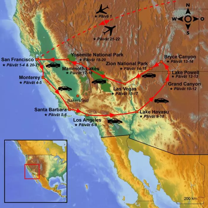 Koe Kalifornian upeimmat kaupungit ja luontokohteet pohjoisesta etelään: San Francisco, Yosemite, Highway 1, Los Angeles ja lopuksi rantakaupunki San Diego.