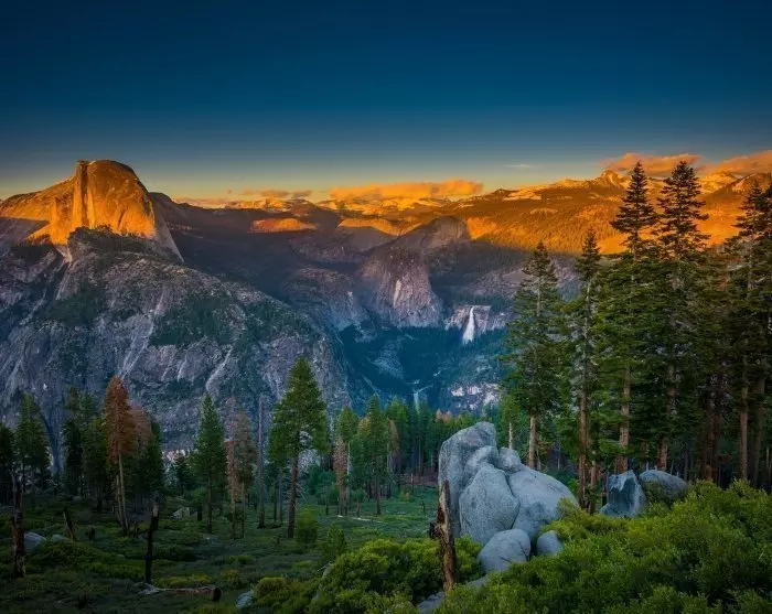 Monet viipyvät Glacier Pointissa auringonlaskuun asti, jolloin Half Dome -vuori näyttää erityisen hienolta hämärän ja hiljaisuuden laskeutuessa puiston ylle. Pimeällä voit nähdä myös sanoinkuvaamattoman upean tähtitaivaan, joka täällä 2 200 metrin korkeudessa tuntuu avautuvan aivan yläpuolellasi.