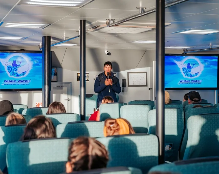 Kun olet pysäköinyt autosi ja tehnyt lähtöselvityksen Whale Watch Kaikouran toimistolla (vähintään 30 minuuttia ennen lähtöä), sinut kuljetetaan bussilla South Bay Marinaan (noin 10 minuuttia). Nouset moderniin katamaraaniin, joka on rakennettu erityisesti valassafareita varten. Kapteeni ja miehistö ovat valmiina tarjoamaan sinulle parhaat mahdollisuudet nähdä valaita, muita merieläimiä ja merilintuja.