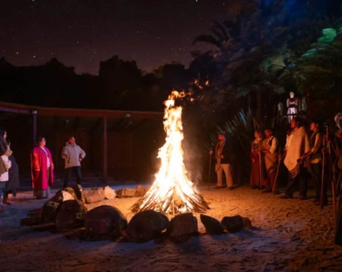 Näet mukaansatempaavan kapa haka -esityksen luonnollisessa amfiteatterissa, jota ympäröivät korkeat tawa-puut ja liekehtivät kokot. Haka, poi ja waiata (laulu) välittävät maorien tarinoita ja perinteitä, mikä luo syvän yhteyden Aotearoan (Uuden-Seelannin) kulttuurisiin juuriin.