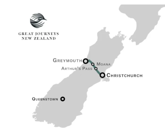 Matka alkaa Greymouthista, missä jätät taaksesi länsirannikon karunkauniit maisemat ja otat suunnan kohti vuoria. Ohitat peilityynen Brunner-järven, jonka luona juna pysähtyy hetkeksi Moanan pikkukaupungissa. Täältä alkaa nousu tiheiden metsien läpi jylhien Eteläisten Alppien keskelle. Matkan varrella kuljet muun muassa Eteläisiin Alppeihin kuuluvan Main Divide -vuoriston alla kulkevaa 8-kilometristä Otira-tunnelia pitkin ennen kuin saavut Arthur’s Pass -solaan, jossa lumiset vuorenhuiput kohoavat ympärilläsi ja näet Eteläsaaren upeimpia alppimaisemia. Selkeällä säällä voit nauttia panoraamanäköaloista syviin rotkoihin, jokiin ja rehevään sademetsään. Maisema muuttuu vähitellen avaraksi ylängöksi sitä mukaa kun juna puksuttaa kohti itää.