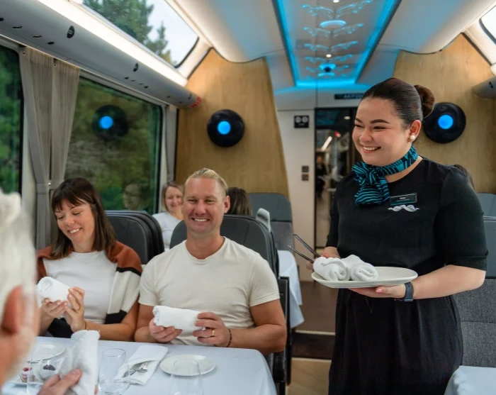 Voit korottaa junalipun tasoa Scenic Plus -lippuun, joka sisältää aterian ja juomat sekä muita lisämukavuuksia.