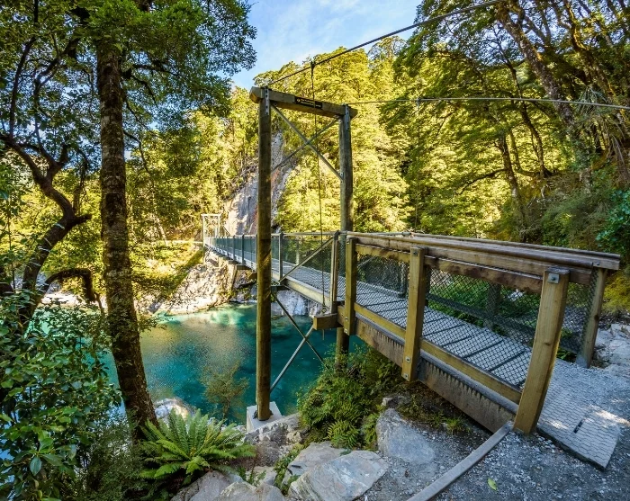 Matkalla Mount Aspiringin kansallispuiston läpi kannattaa harkita lyhyttä vaellusta Blue Pools Trackilla. Helppokulkuinen reitti kulkee pyökkimetsien halki kirkkaan turkooseille altaille, joiden saavat värinsä alueen jäätiköiden sulamisvesistä.