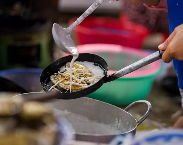 Sen jälkeen cyclo vie sinut pienille, linnakkeen muurien takana kiemurteleville kaduille ja seuraavaan ravintolaan. Siellä näet, kun kokki valmistaa Huén perinteisiä banh khoai -pannukakkuja. Tuunaa ateriasta mieleisesi tuoreilla yrteillä.