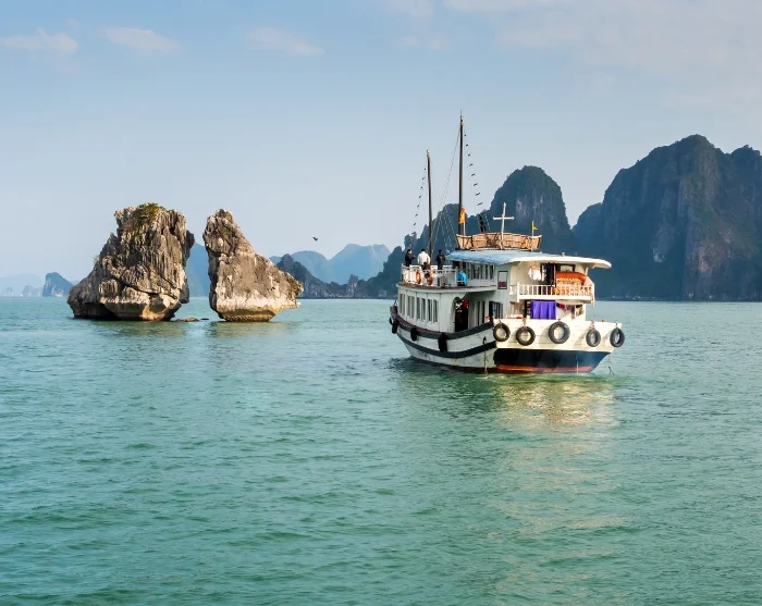 Laivaan noustessasi saat tervetuliaisjuoman, ja miehistö esittelee lyhyesti tulevan seikkailun. Sen jälkeen voit majoittua omaan hyttiisi ja valmistautua herkulliseen lounaaseen, joka koostuu sekä vietnamilaisista erikoisuuksista että kansainvälisistä annoksista. Risteilyalus lipuu rauhallisesti eteenpäin ja matkan varrella voit ihailla Halonginlahden vaikuttavia kalliomuodostelmia, kuten Incense Burneria, Dog Stone Isletiä, Fighting Cock Isletiä ja Three Coconuts Islandia.