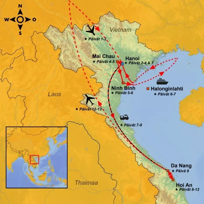 Pohjois-Vietnam tarjoaa upeita elämyksiä, kiehtovaa kulttuuria ja mahtavia luontokohteita. Pääkaupunki Hanoi tarjoaa kiehtovan yhdistelmän historiallista arvokkuutta ja modernia vilskettä, kauniita siirtomaa-aikaisia taloja ja perinteisiä markkinoita, joiden kojut notkuvat eksoottisia hedelmiä ja kasviksia. Mai Chaun etnisten kansojen asuttamissa kylissä, riisipelloilla ja vehreillä ylängöillä pääset tutustumaan perinteisen vietnamilaisen maaseudun elämäntapaan. Tam Cocin kiehtovissa maisemissa vihreäkylkiset vuoret nousevat tasaiselta ylängöltä kuin kivettyneet jättiläiset. Matkan aikana pääset näkemään myös Halonginlahden lumoavat kalliosaaret. Kiertomatka huipentuu muutaman päivän leppoisaan rantalomaan Hoi Anissa.
